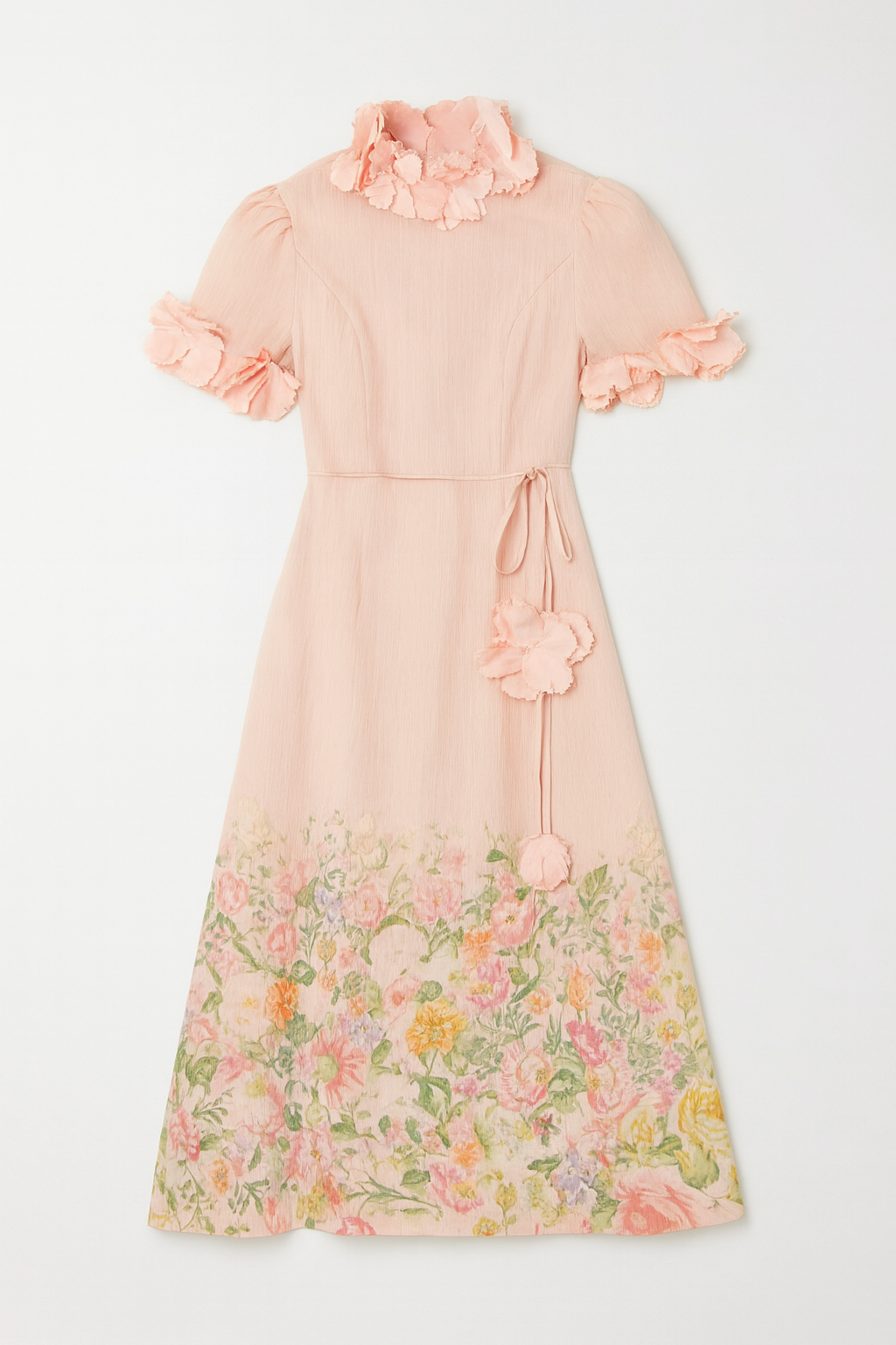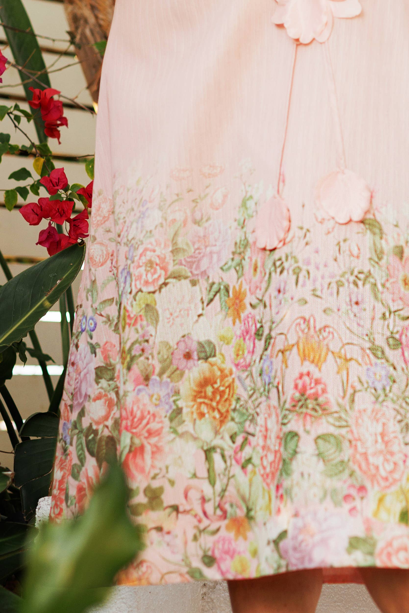 This powder pink midi dress features a 3D floral neckline and short sleeves, adding texture and dimension to its feminine design. The soft pink fabric gently ombres into the floral pattern at the bottom of the dress, where the flowers bloom in intricate detail. A belt with a flower accent at the end adds a stylish finishing touch and can be tied in multiple ways for a customizable fit. This dress blends elegance with modern charm, perfect for special occasions.