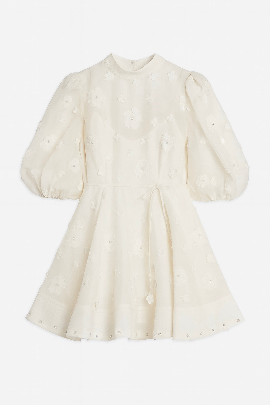 This mini flared dress features balloon sleeves that extend to the elbows, creating a soft puff. The high neckline adds an elegant touch, while the sheer fabric is adorned with intricate 3D embroidered flowers, each with a silver gem at the center. A thin belt, also featuring the same floral details, can be tied in various ways to enhance the waistline. The dress is lined with a tank top for coverage, while the sheer fabric reveals the arms and neckline. A zipper at the back ensures a secure fit. This dress combines feminine charm with modern elegance, perfect for special occasions.