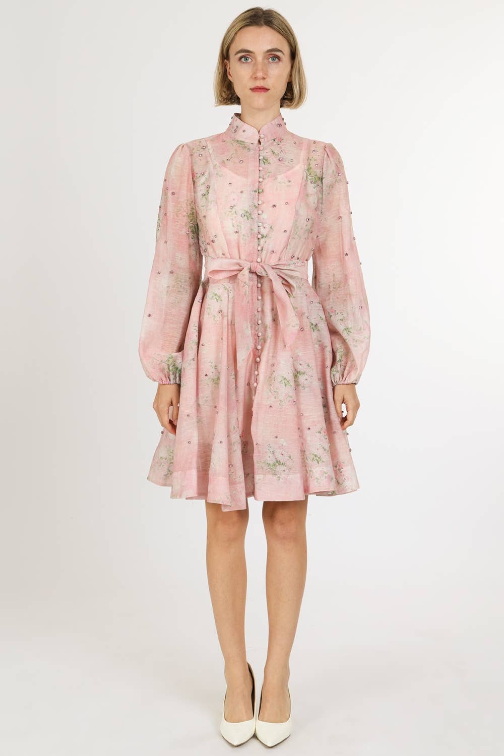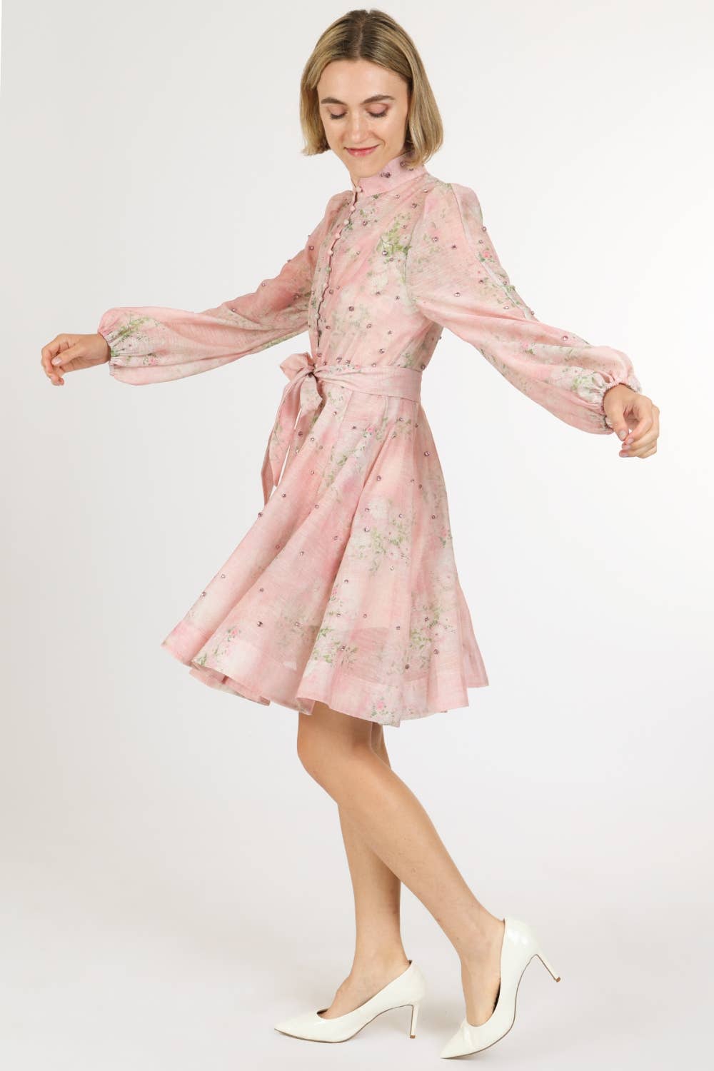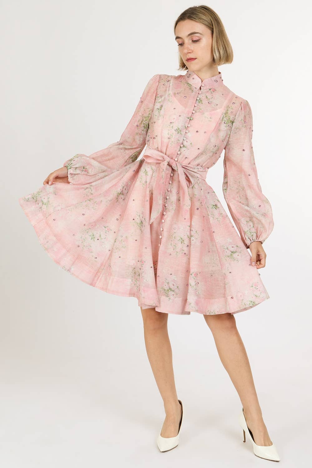 Floral Print Embellished A-Line Dress Cotton-blended fabric Linen texture style Colored faux rhinestone embellishment Slit curved mock nock Front button loop closure Back zipper closure Long bishop sleeves Elastic cuffs Self waist tie A-line dress Midi length Regular fit Imported Available in Green & Pink Model is 5' 9" wearing S size Caring for your clothes is caring for the environment Wash your clothes with lower temperature and delicate spin cycles. It helps to maintain the color, shape and structure of the fabric. At the same time it reduces energy consumption that is used in care processes