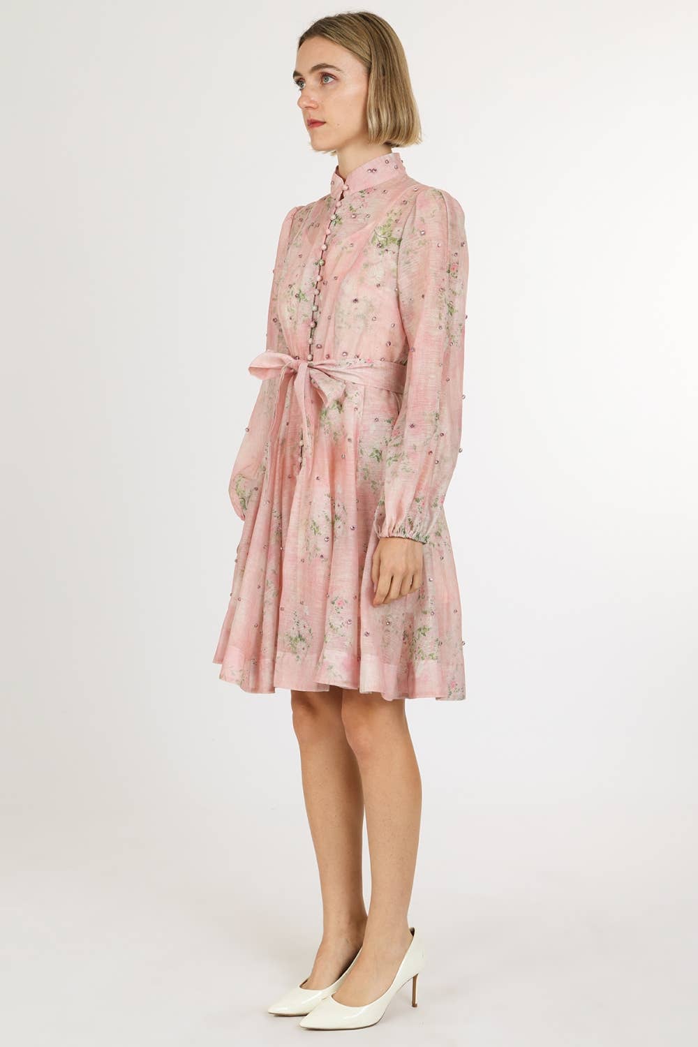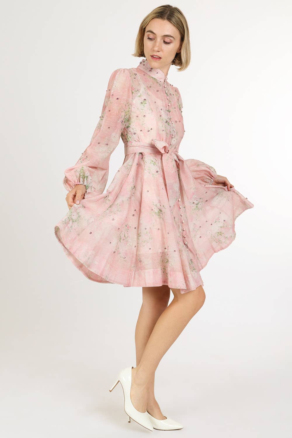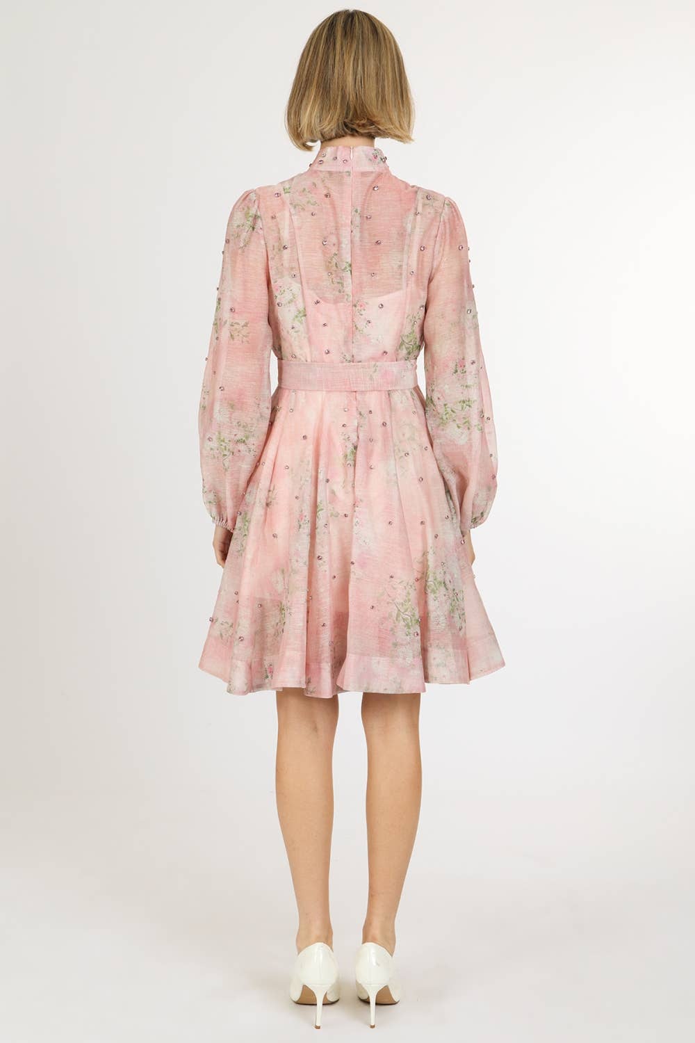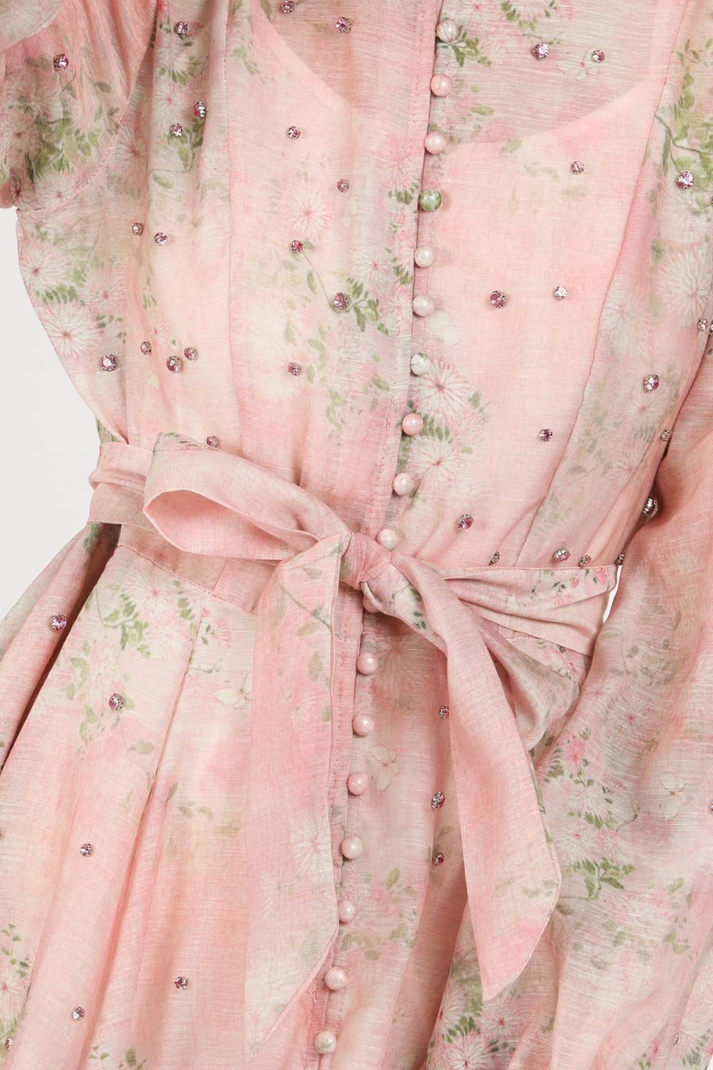 Floral Print Embellished A-Line Dress Cotton-blended fabric Linen texture style Colored faux rhinestone embellishment Slit curved mock nock Front button loop closure Back zipper closure Long bishop sleeves Elastic cuffs Self waist tie A-line dress Midi length Regular fit Imported Available in Green & Pink Model is 5' 9" wearing S size Caring for your clothes is caring for the environment Wash your clothes with lower temperature and delicate spin cycles. It helps to maintain the color, shape and structure of the fabric. At the same time it reduces energy consumption that is used in care processes