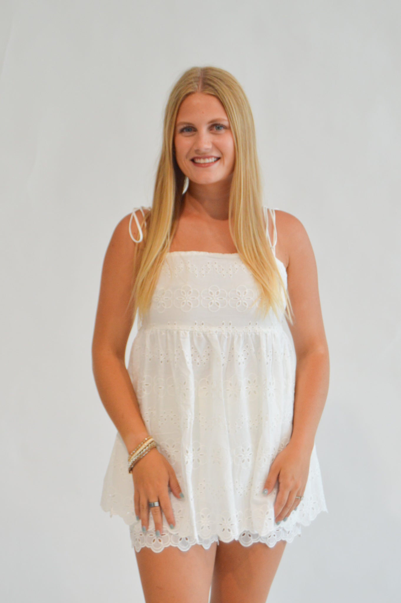 With thin spaghetti straps which tie and a simple straight across neckline that sits easily on the body and is flattering for all body shapes.